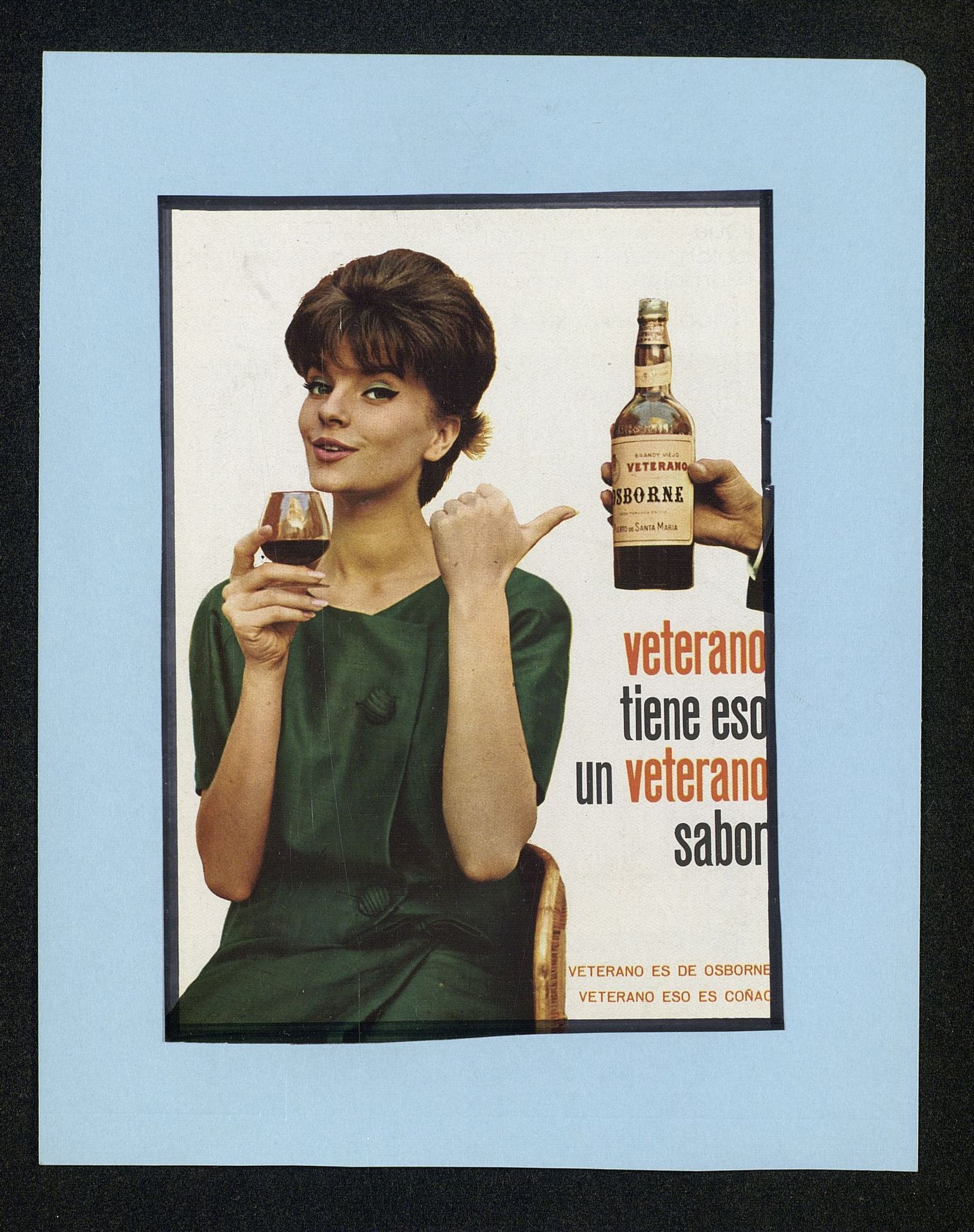 Veterano tiene eso. Un veterano sabor. Veterano es de Osborne, Veterano eso es coñac. Elena Balduquecon copa en la mano y señalando con el dedo una botella de Veterano