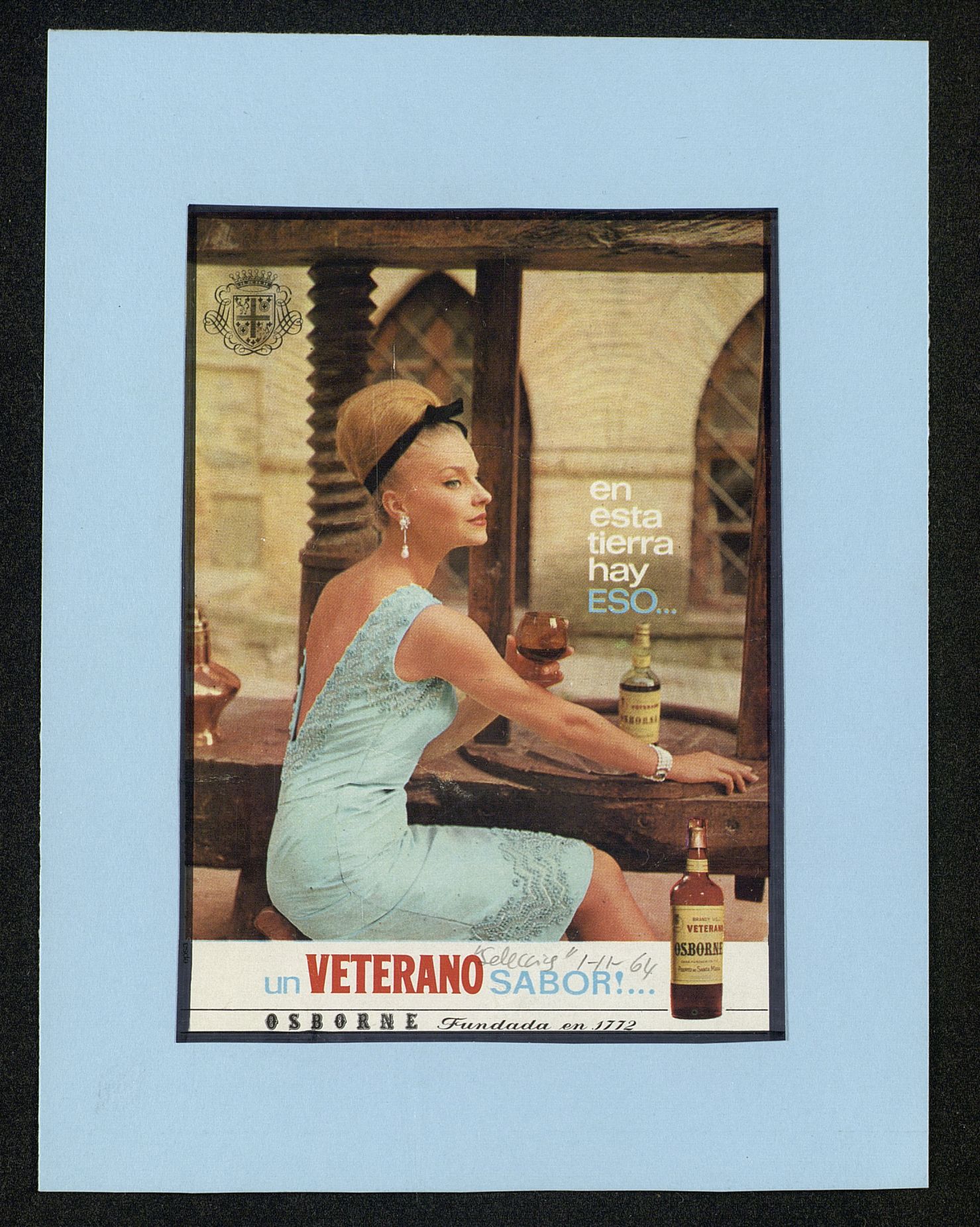 En esta tierra hay eso...un Veterano sabor. Elena Balduque sentada con vestido azul, copa y botella Veterano
