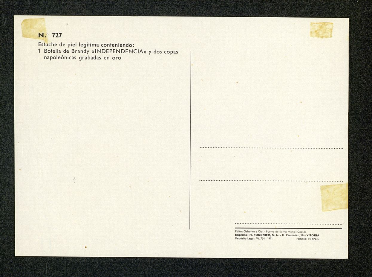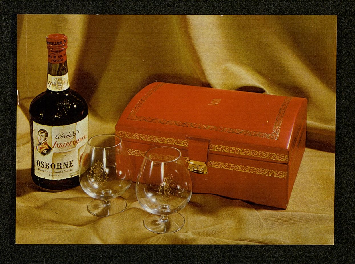 Estuche de piel legítima n 727. Contenido 1 botella de Brandy Independencia y dos copas napoleónicas grabadas en oro Fotografía,Postal