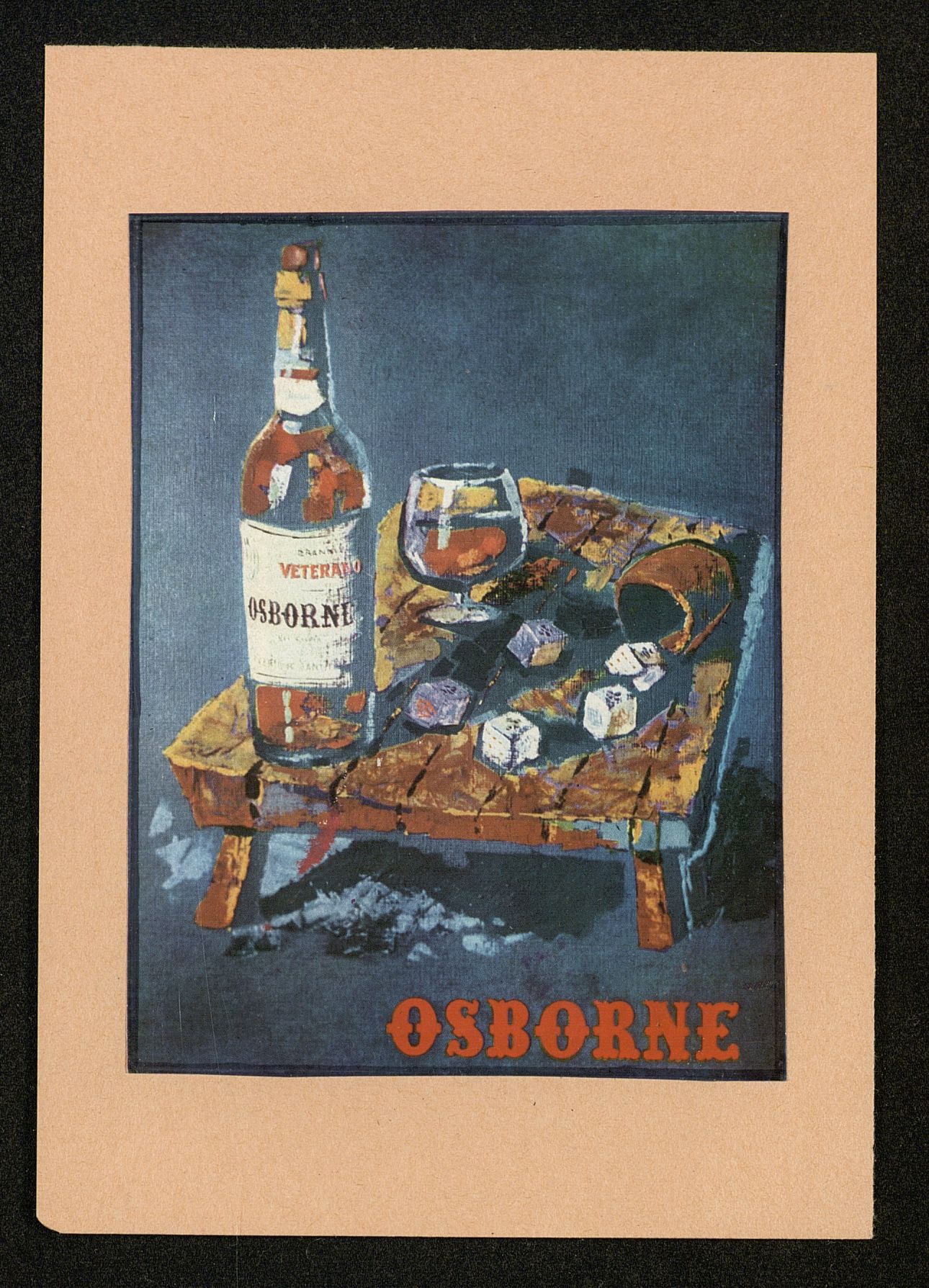Veterano Osborne. Mesa con botella de Veterano, dados y copa