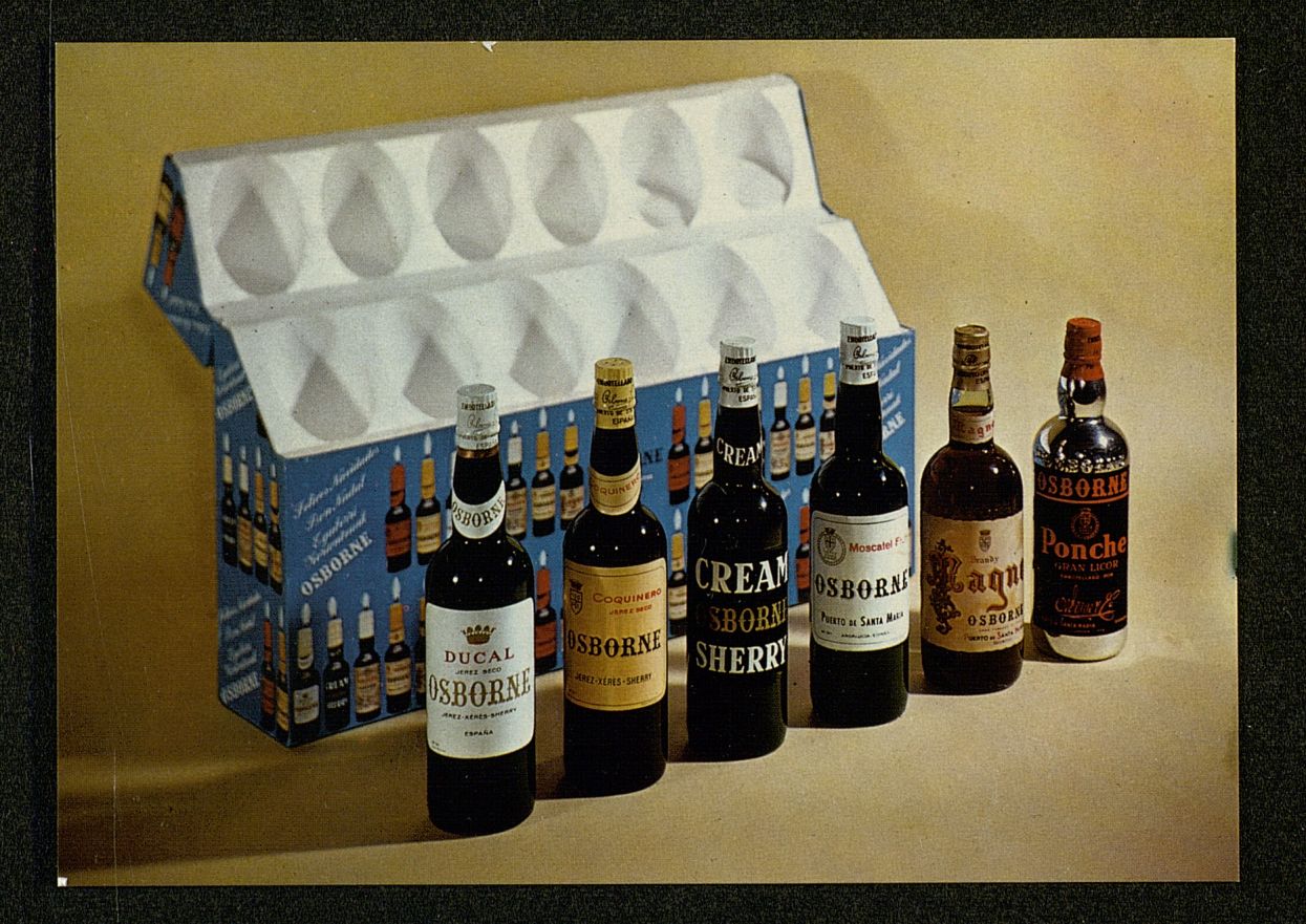 Estuche n 785. Coteniendo 1botella de Jerez seco Ducal, de Jerez amontillado Coquinero, de Cream Sherrry, de Moscatel Fruta, de Brandy Magno, de Ponche Osborne Fotografía,Postal
