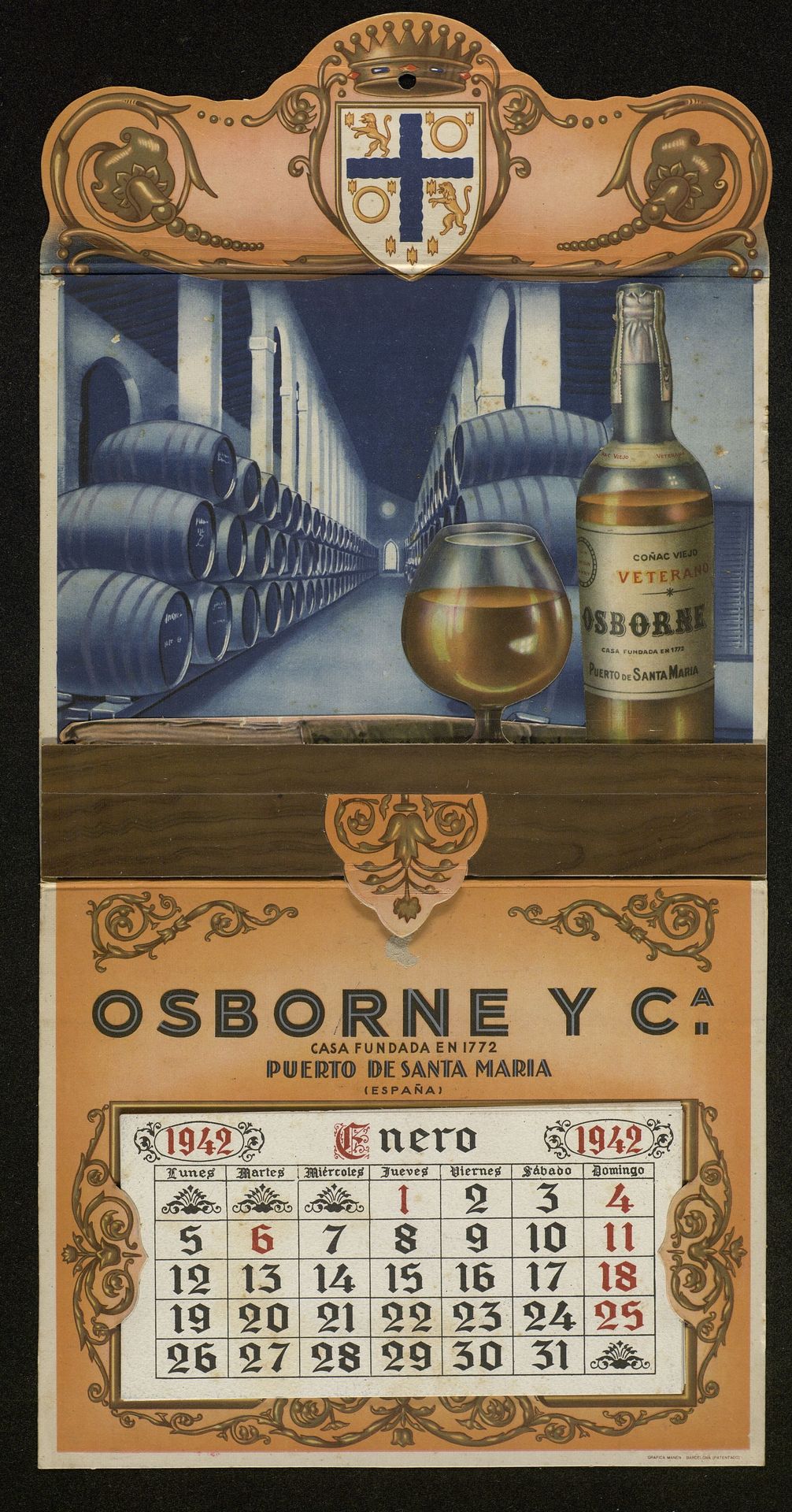 Coñac Viejo Veterano. Calendario despegable con imagen de Bodega, botella de Veterano y copa año 1942
