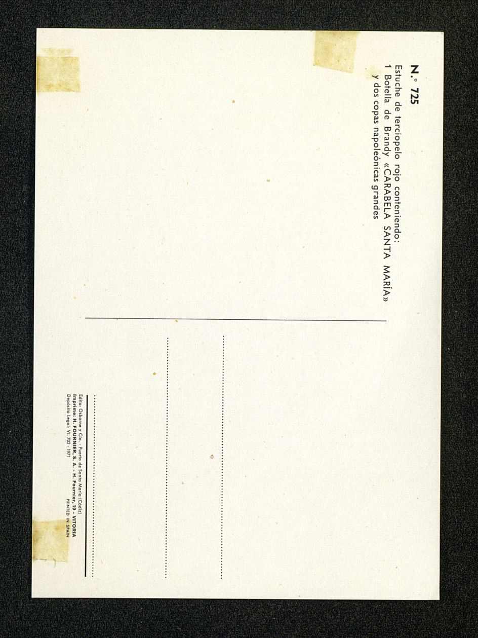 Estuche de terciopelo rojo n 725 conteniendo 1 botella de Brandy Carabela Santa María y dos copas napoleónicas grandes Fotografía,Postal