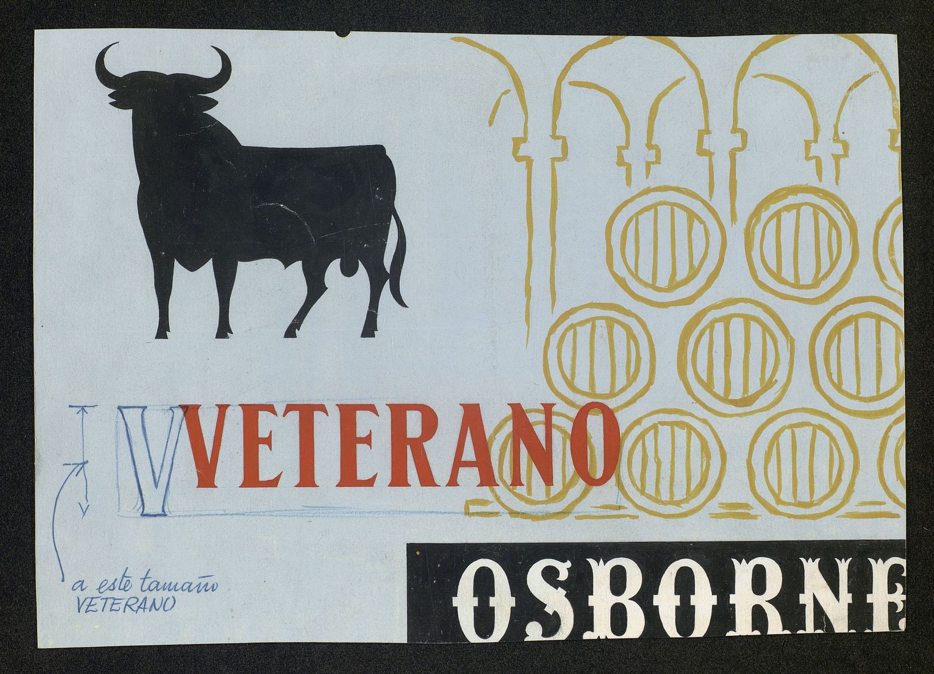 Osborne. Publicidad artística de Veterano. Diseño de las letras con aumento de tamaño. Toro Osborne y bodega hechos a mano Arte final