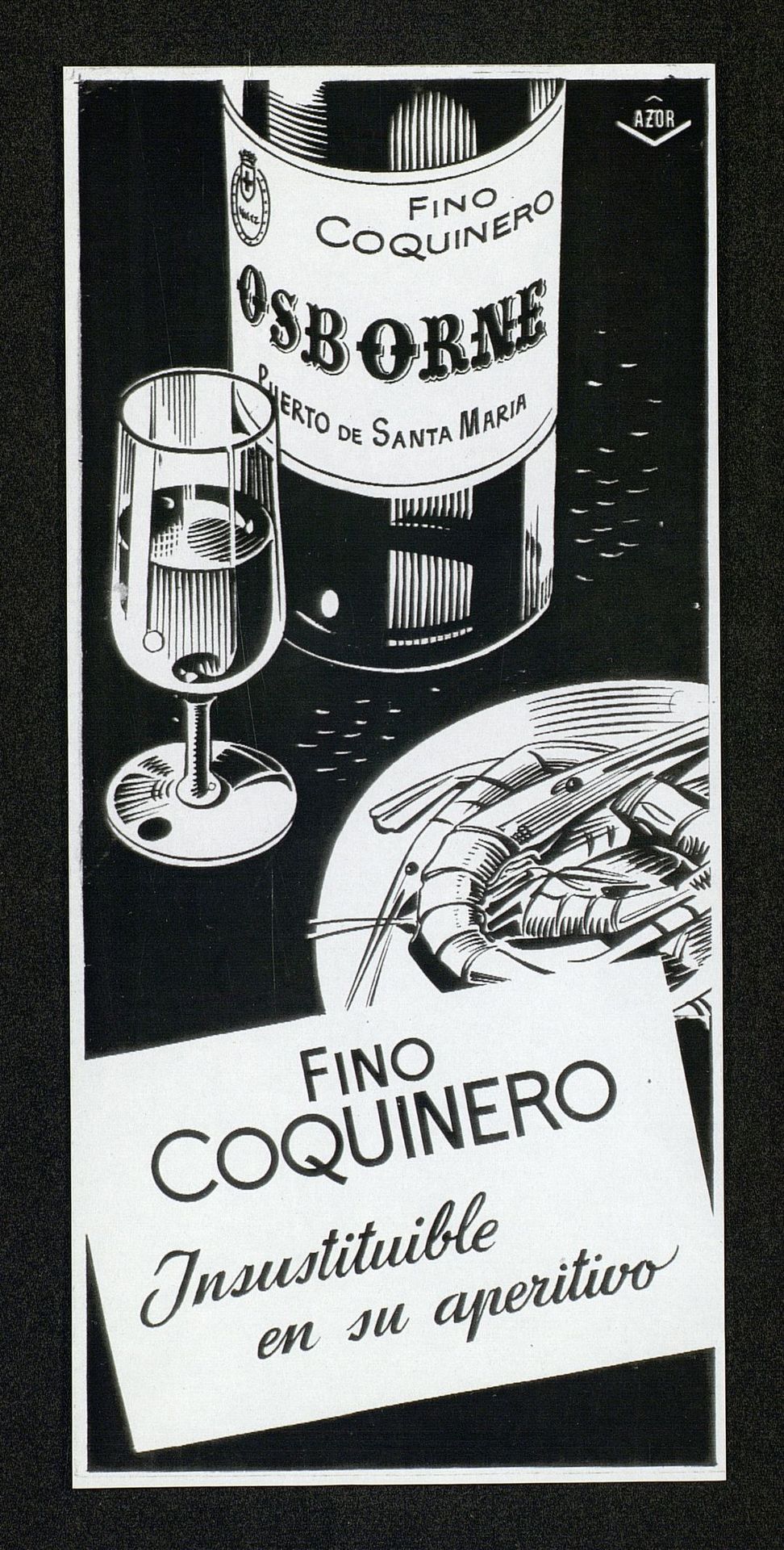 Insustituible en su aperivo. Botella de Fino Coquinero con copa y plato con langostinos