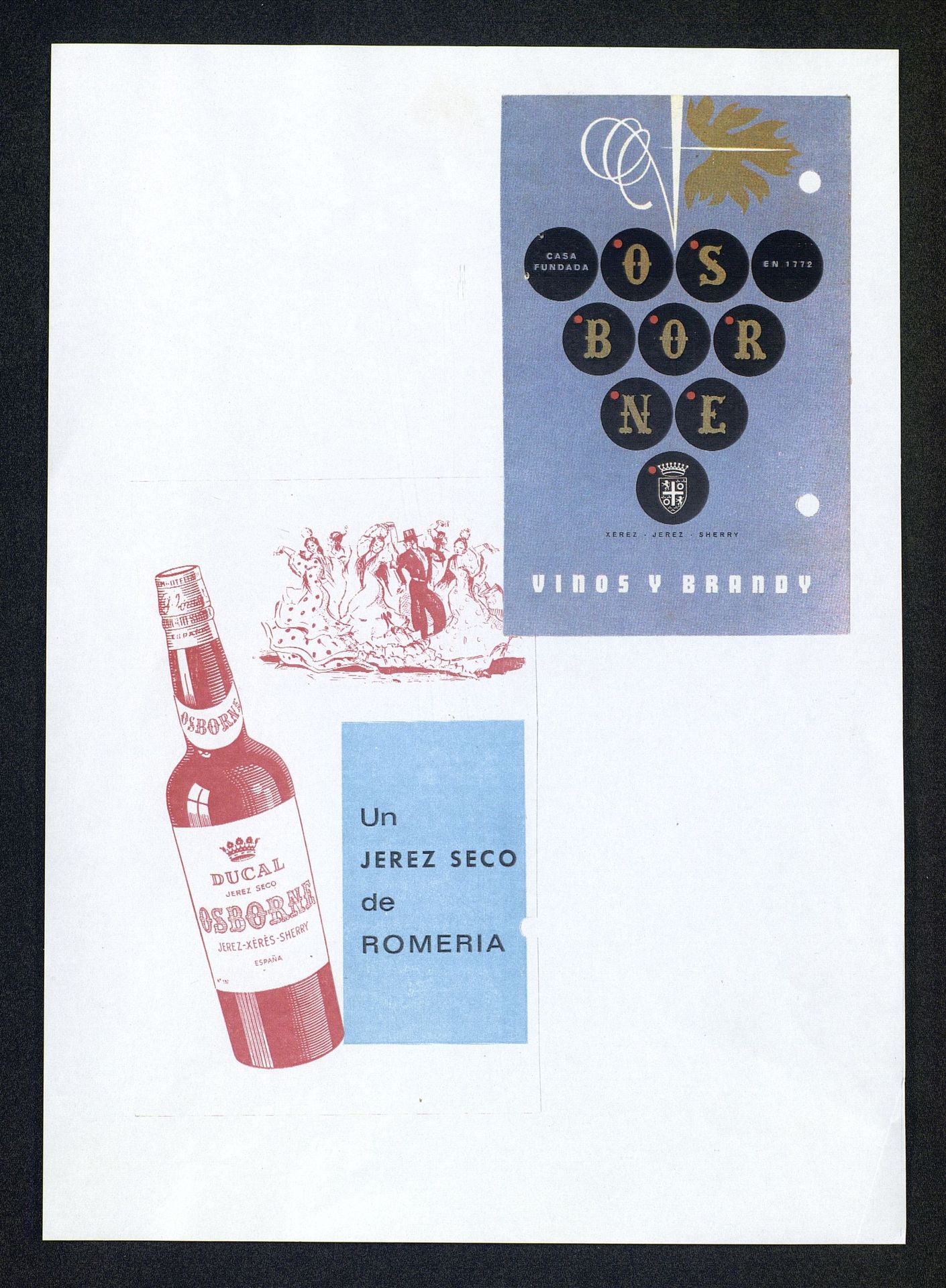 Ducal un Jerez Seco de Romería. Bailadoras flamencas y bailador flamenco. Vinos y Brandy, racimo de uvas con una letra de la palabra Osborne en cada uva