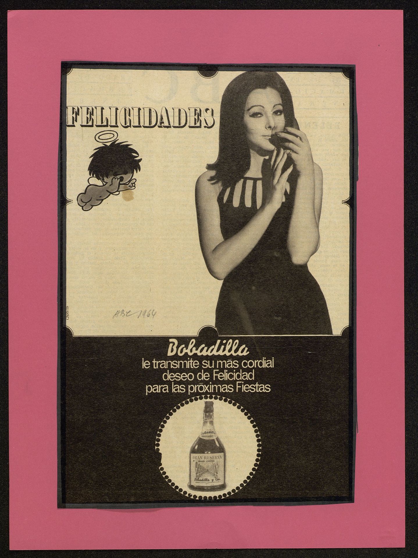 Felicidades Bobadilla le transmite su más cordial deseo de Felicidad para las próximas Fiestas. Chica con copa en la mano y dibujo de un angelito