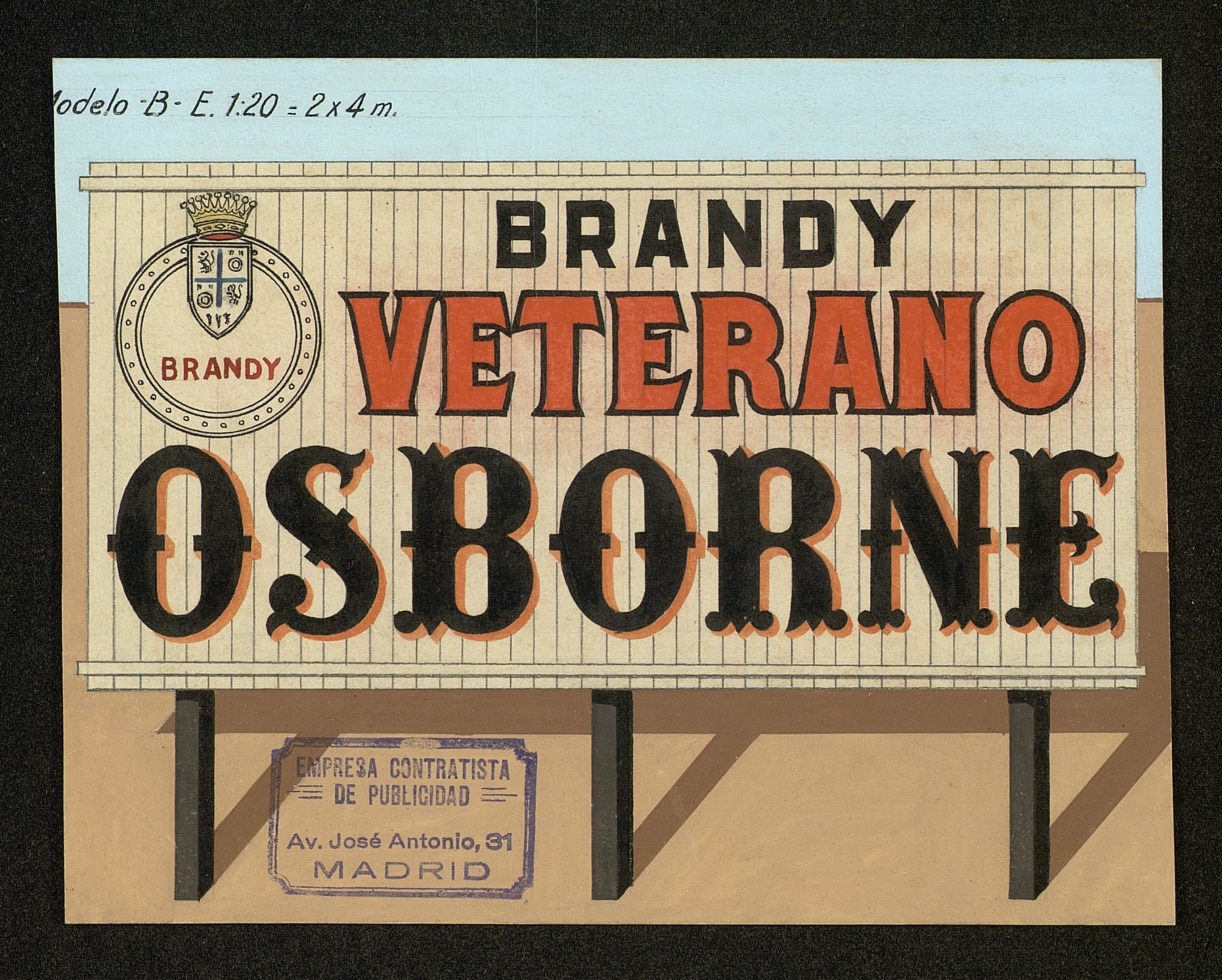 Brandy Veterano Osborne. Modelo B E.1202x4 m. Empresa contratista de publicidad, Madrid. Publicidad artística hecha a mano Arte final