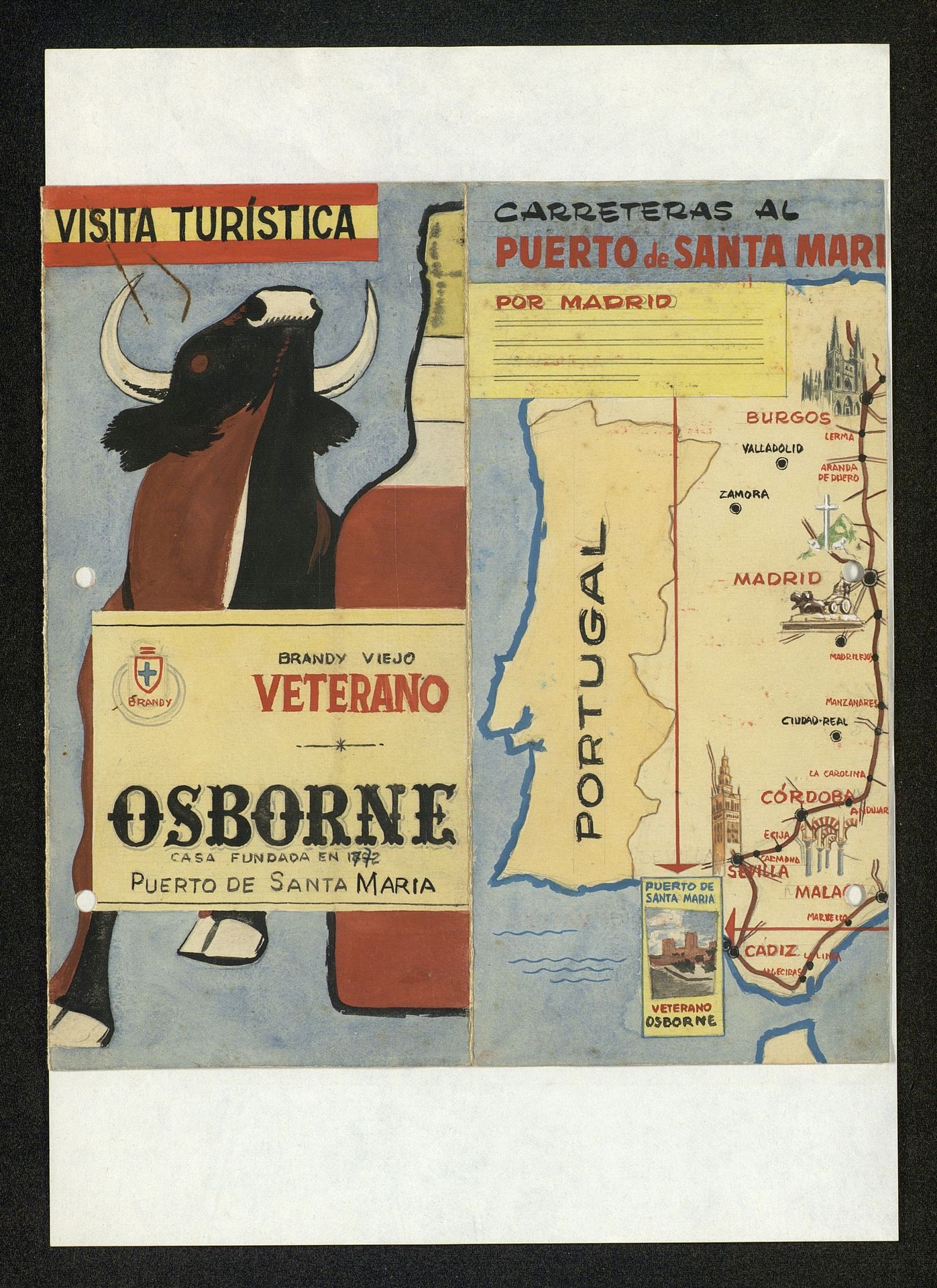Folklore español...Visita turística. Carretera al Puerto de Santa María desde Madrid. Diseño del mapa de España con la ruta indicada. Publicidad artística Arte final