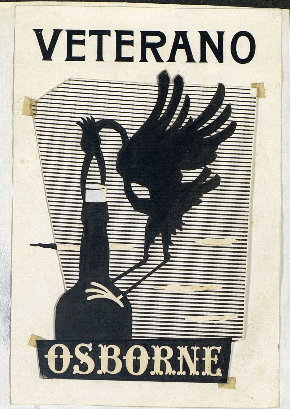 Diseño artístico de una cigueña quitando el tapón a la botella de Veterano. Realizado a mano en blanco y negro Arte final