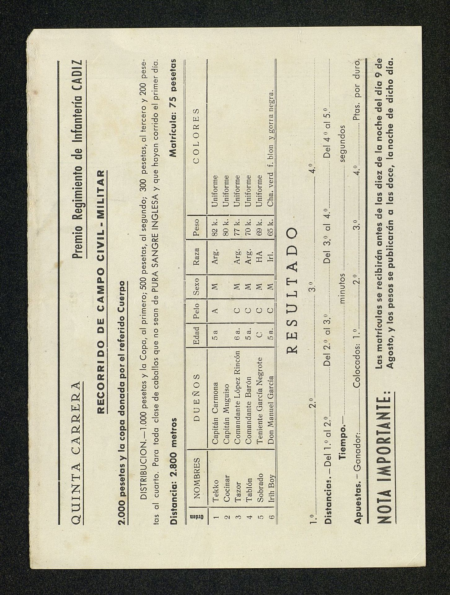 Quinta carrera, premio Regimiento de Infantería -Cádiz, recorrido del campo civil-militar. Si pide un Veterano, beberá un buen coñac Arte final