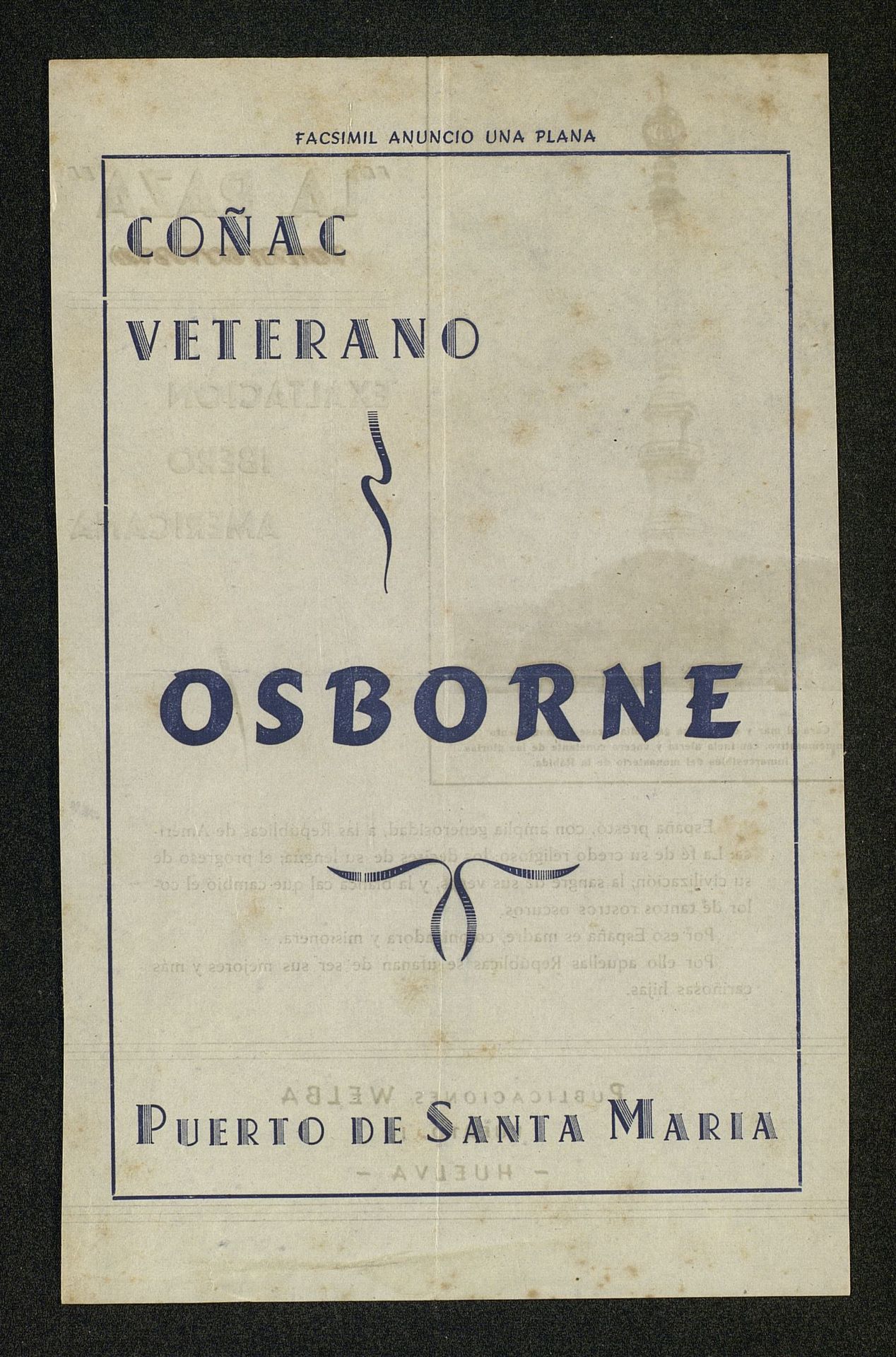 Facsímil anuncio una plana Coñac Veterano Osborne