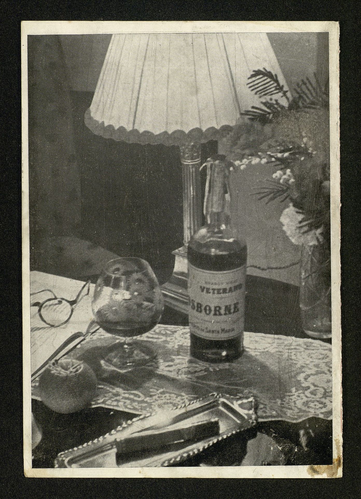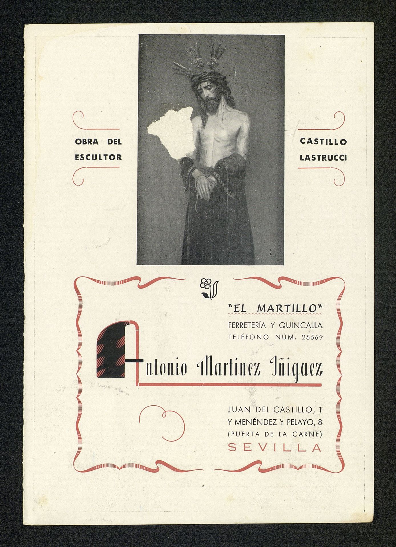Obra del escultor Castillo Lastrucci. El Martillo, ferretería y quincalla. En el verso publicidad de Veterano Osborne