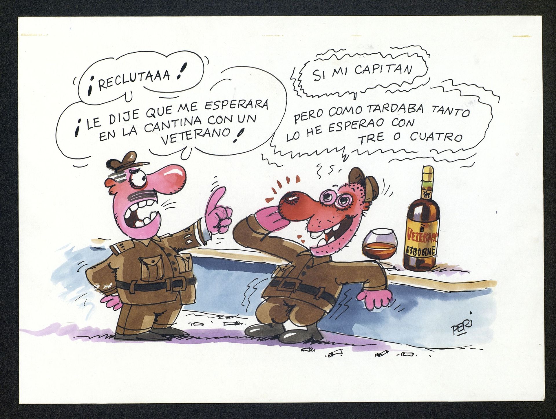 Veterano. Viñeta dos militares en la cantina con botella de Veterano Arte final1, Viñeta