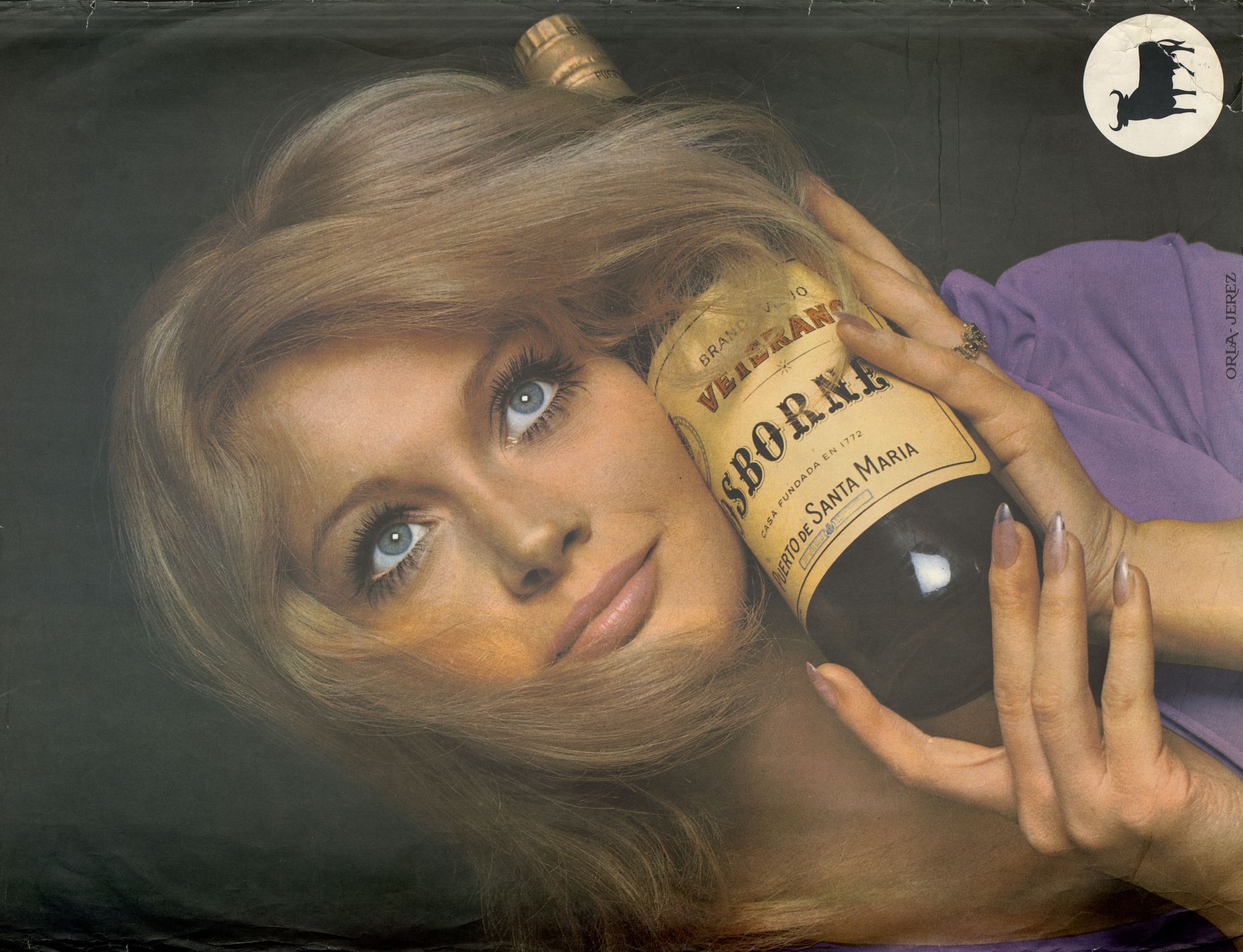 Brandy Viejo Veterano. Mujer rubia con botella de Veterano Cartel1
