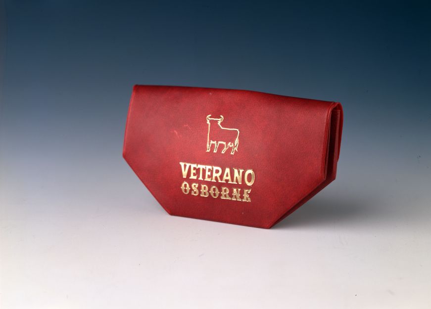 Monedero rojo con las letras Veterano Osborne en dorado Negativo fotográfico