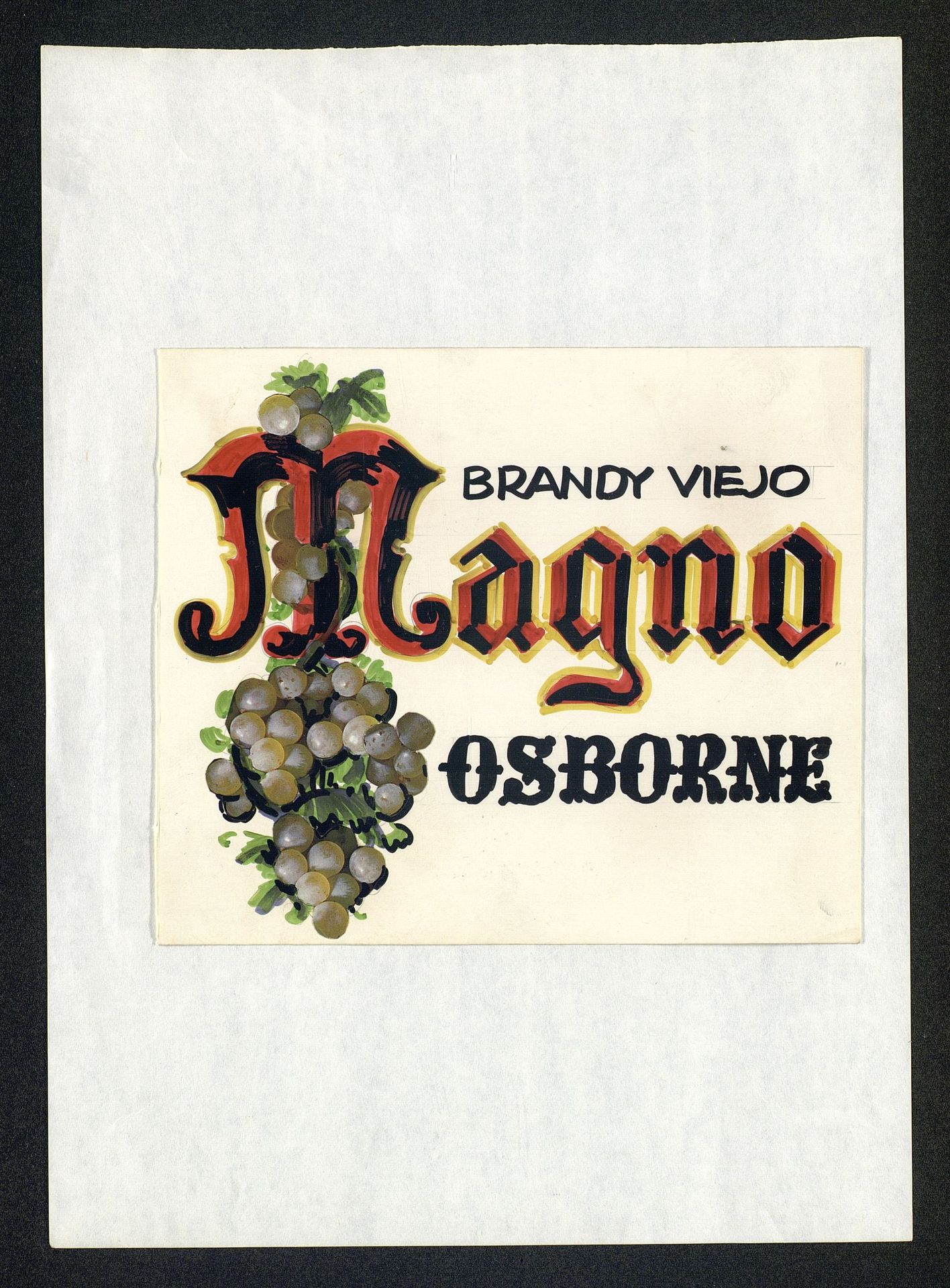 Brandy Magno Osborne. Diseño publicitario artístico hecho a mano. La M de Magno con un gracimo de uvas Arte final