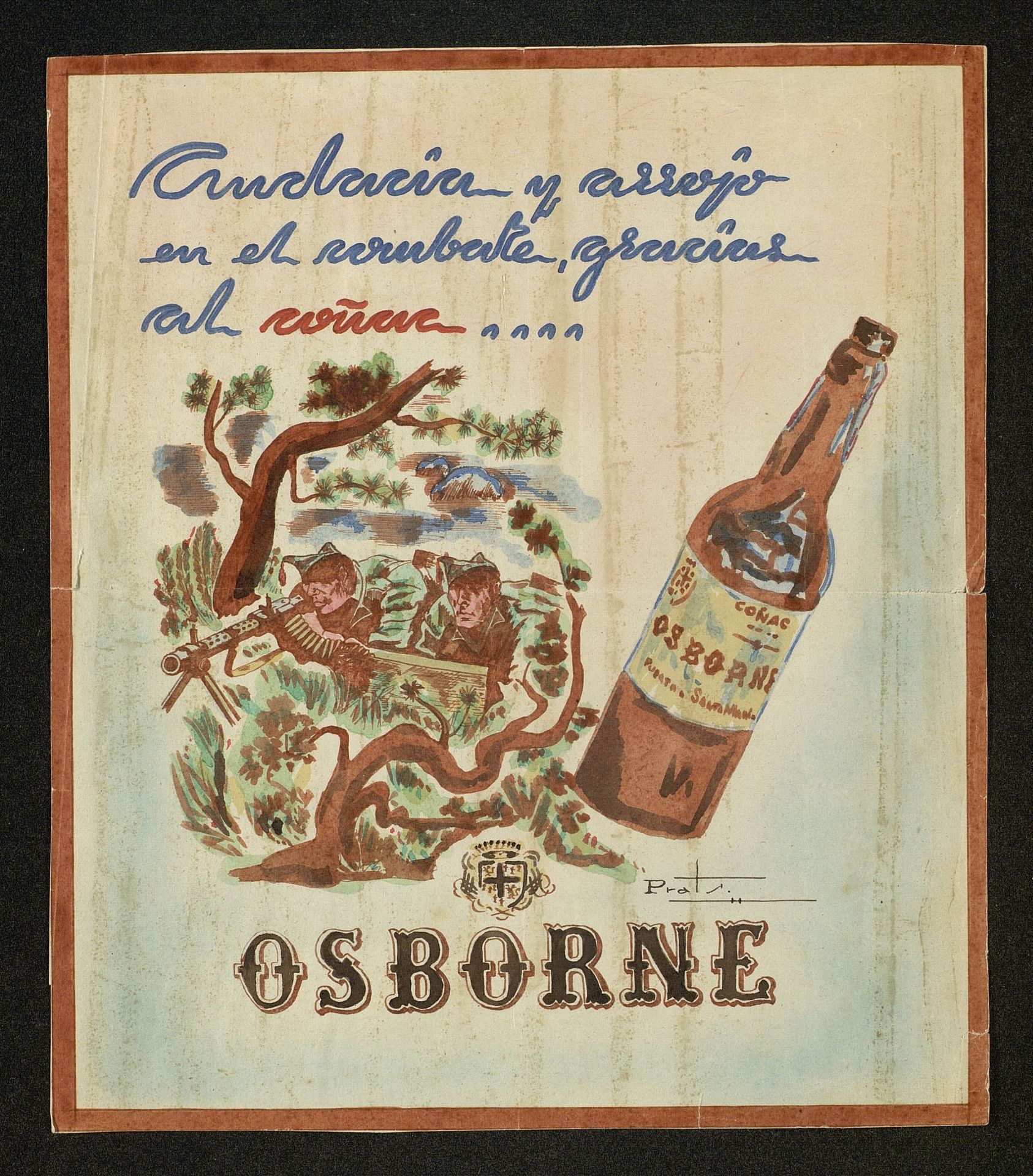 Coñac Osborne. Publicidad artística hecha a mano, soldados y botella de coñac Osborne Arte final