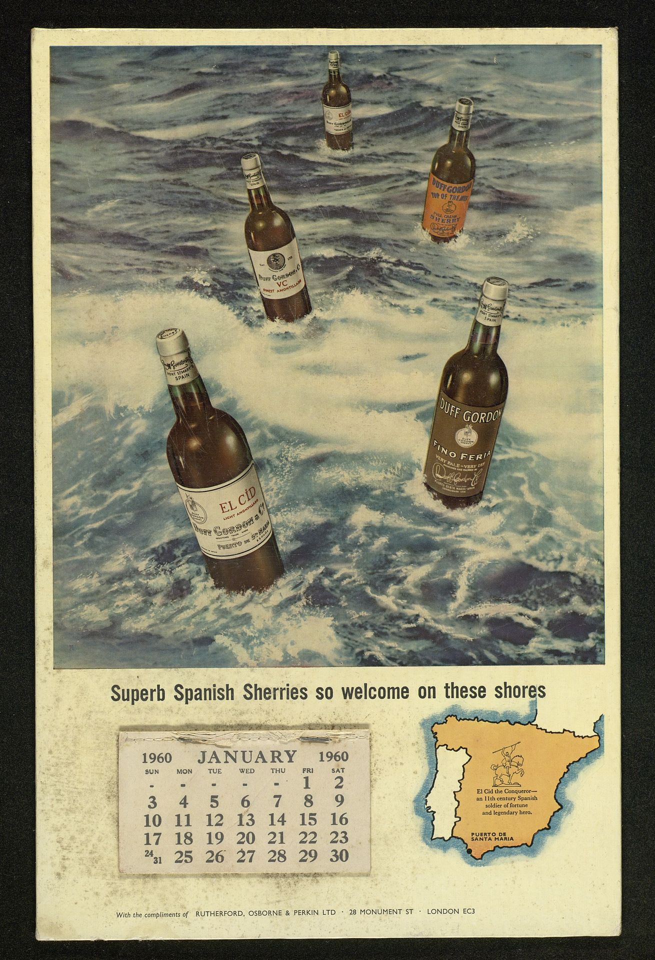 Super Spanish Sherries so welcome on these shores. Botellas de El Cid, VC Amontillado, Fino Feria...Calendario año 1960